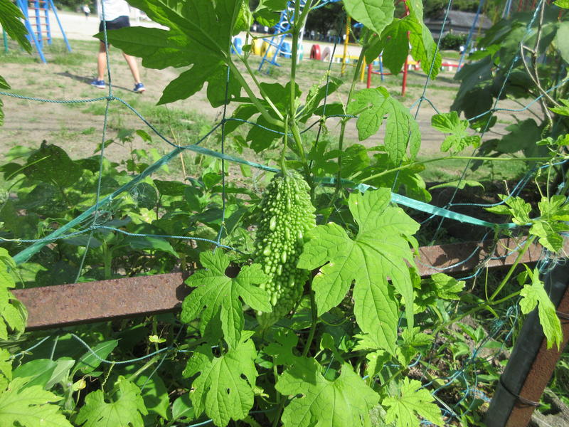 休校中に種をまいたツルレイシ(ゴーヤ)の実がなっています