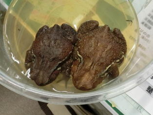 2年生の国語の中に「お手紙」というお話があります。その主人公はがまがえるの「がまくん」で、手紙をもらったことのないがまくんに友達のかえるくんが手紙を書いて出し、二人とも幸せな気持ちになるというようなお話です。本物のがまがえるはなかなか見ることがありませんが、保護者の方がたまたま見つけて持ってこられました。子どもが何を勉強しているか知っておられ、「本物のがまがえるはこんな姿だよ」と、子どもたちのために持ってこられたことを大変ありがたく思います。まず、2年生が順番に見て、そのあとほかの学年の子どもたちにも見てもらいました。