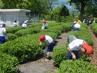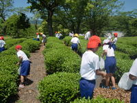 菊鹿小元校長先生の田代先生のご指導の下、3年生が茶摘み体験をしました。みんなで5キロほどのお茶の葉を摘みました。新芽の先端から二枚の葉のついた部分(一芯二葉)は玉露や煎茶などの最上級品になるそうです。摘んだ茶葉は製茶していただきます。田代先生には、5年生が稲作りでもお世話になります。
