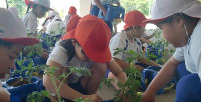 2年生の生活科の学習で、JA鹿本菊鹿支部とJA鹿本園芸部から来ていただき、ご指導を受けながら、ミニトマトの苗植えをしました。甘いかな、大きいかな、いくつなるのかな、1個目はいつかな、とわくわくの子どもたちです。お世話と観察を丁寧にしていきます。