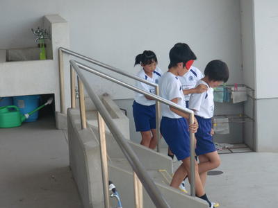 万が一の場合には、「パニックにならず、浮いて待つことが大切」だと教えてもらい、実技を行いました。そもそも人間は、体の2%が必ず浮くようになっているそうで、そのしくみを利用すれば、川や海に落ちたとしても、水に浮いた状態で助けを待つことができるとのことでした。低学年では仰向けになってペットボトルを胸に抱き、あごを上げ水中から鼻と口を出すことがなかなか難しかったようです。「サンダルや靴も浮く道具になることがわかった。」「水を吸った体育の服は思ったより重い!」「あわてないことが大切だとわかった。」と子どもたち。危機回避のための行動を体験し、パンフレットを使って改めて確認するようにしました。かけがえのない命を守るために、何事もあらかじめ備えておくことが大切ですね。