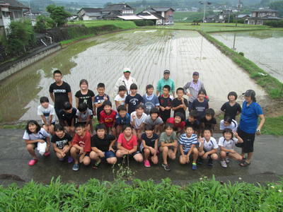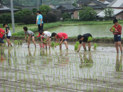 今年はなかなか雨が降らず、5年生の田植え体験は2回延期していました。地域の方々のご協力を得て、ようやく実施の運びとなりました。地域の方々に支えていただいていることに感謝します。腰を曲げての作業や泥に四苦八苦した子どももいたようです。今後は稲の生育を見ながら、田んぼに10羽の合鴨を放ち、合鴨の力も借りながら(合鴨農法)米づくりを行います。