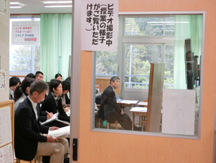 県下各地から多くの先生方が授業マイスターである迎田先生の授業を見にこられました。教室の中に入って参観できないので教室の後ろからビデオカメラで撮影しそれを他の大型テレビにつなぎ教室で見ていただきました。授業の見通しを持たせる工夫や分かりやすい黒板の使い方など特別支援教育の指導の方法は通常学級の中でも生かされています。