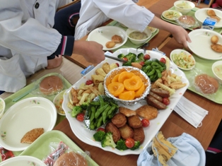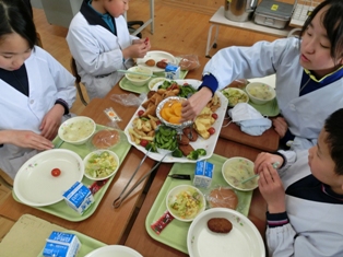 今日は、6年生の卒業を祝い(ちょっと早いですが)、6年生だけのスペシャルメニュー、バイキング給食でした。大きな皿に卵焼きや枝豆、フランクフルトなどが盛られ、バイキング形式でいただきました。給食の先生方には班ごとに分けて準備していただきありがとうございました。給食の時間も小学生時代の良き思い出となりますが、今回のバイキング給食は給食に関する思い出No1になることだと思います。