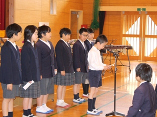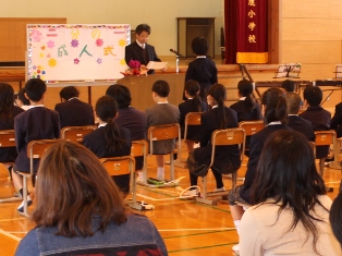 体育館で4年生の二分の一成人式が行われました。担任の先生から「二分の一成人証」をいただき、一人一人将来の夢を発表しました。その後、感謝の言葉を書いたお礼の色紙をおうちの方に私、おうちの方からお祝いのメッセージをいただきました。最後に合奏を歌をおうちの方にプレゼントし、全員で「おとうさん、おかあさん、おじいちゃん、おばあちゃん、家族の皆さん、今までありがとうございました。・・・」と感謝の言葉を述べました。おうちの方からのメッセージは子どもたちの大きな宝物になったことと思います。残りの写真は行事アルバムに掲載しています。