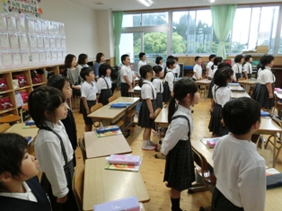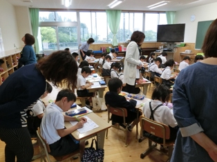 5時間目に、1年生が卒園した保育園、幼稚園の先生方に授業を見に来ていただきました。子どもたちはチャイムが鳴る前から、窓の外をながめながら「まだこない」といってとても待ち遠しそうでした。先生たちが来られると、手を振ったりして大喜びでしたが、授業が始まると、いつものように「ちょこ・ぺた・ぴん・とん」の声で姿勢を正して、授業に取り組みました。授業のあとは、保育園、幼稚園の先生方と情報交換会を行いました。入学前だけでなく入学後も幼稚園、保育園の先生方と連携して子どもたちの教育に当たっています。