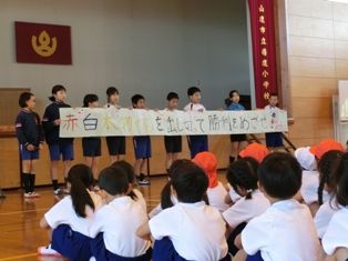 朝の活動の時間に運動会の結団式を行いました。最初に運営委員の子どもたちが本年度の運動会のテーマ「赤白本物の力を出し切って勝利をめざせ!」を発表し、その後、赤団、白団毎に応援団長、リーダーの自己紹介を行いました。最後は、大きな声で気合いを入れて終わりました。本物の力を練習の時から発揮して、本番では、演技や競技、係の仕事、応援に頑張り、さすが菊鹿小の子どもたちだ!と言われるような姿を見せて欲しいと思います。