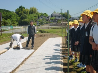 JAの方の指導で、2年生がトマトの苗を植えました。最初校舎東側のピロティで作業をしていましたが、風が強く苗が折れたりしたので、場所を図工室前に移して作業を行いました。苗の根元にはクリップが着いており、接ぎ木をして、元気に育てておいしトマトを作る工夫をしてあることや、根が水分や栄養をとりやすいように、苗を完全に土の中に入れず8分目までしか入れなくてよいことなどを教えていただきました。残りの写真は行事アルバムに掲載しています。