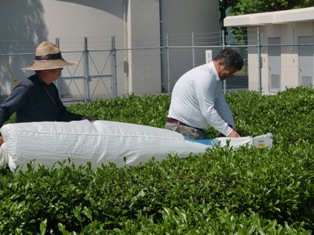 3年生が校内の茶畑で茶摘みをしました。最初に田代先生からお茶の葉の摘み方を教えていただきました。新芽の先から3~4枚の葉を摘んでビニル袋に入れました。あっという間に袋いっぱいになり、摘み残した葉は、先生たちが機械で刈りました。残りの写真は行事アルバムに掲載します。
