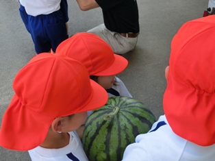 今年もJAからスイカをいただきました。1年生が代表で受け取り、3人がかりでかかえました。明日の給食で食べる予定です。昨年度は新聞やテレビの取材がありましたが、今年はなかったので1年生の子どもたちは残念がっていました。残りの写真は行事アルバムに掲載します。