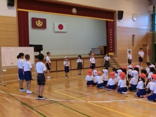 梅雨に入り、雨も降り気温も低かったので、体育館でプール開きを行いました。全国では毎年プールや川での事故が報告されています。子どもたちが水から自分の命を守ることができるようにしっかりと水と仲良しになってほしいと思います。また、水泳は「いきつぎができるようになる」「25メートル泳げるようになる」などと目標を立てやすく、達成感を味わいやすい運動です。5、6年生は水泳記録会も7月15日(土)に開催されます。プールの決まりを守って、しっかりと練習してほしいと思います。