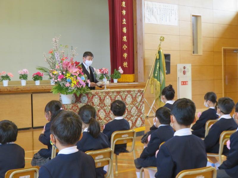 4月9日(金)に菊鹿小学校第6回入学式が行われました。今年は36名の元気な1年生が入学してくれました。天候にも恵まれ、校庭や花壇の花々も1年生の入学を祝うかのように色とりどりの花を咲かせています。式には在校生を代表して6年生が参加してくれ、36名の1年生の入学に花を添えました。月曜日からいよいよ小学校生活が始まります。まずは車に気をつけて学校に登校して欲しいと思います。