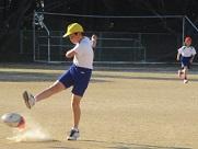 朝、登校後、外遊びに興じる子どもたち。元気いっぱいの姿はいいですね。子どもたちに人気の遊びは、「ブランコ」「野球」「バレー」「フリスビー」「うんてい」「追いかけっこ」。最近それらに「ラグビー」が加わりました。ラグビー経験者の先生も子どもたちと遊んで下さっています。丸くないボールは、なかなか扱いにくそうですが、子どもたちは笑顔でチャレンジしています。