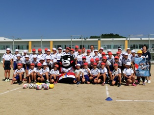 また、せっかくなのでくまもんの担当の方に質問してみました。Q「くまもんは何人いるんですか?」、A「くまもんは1人しかいませんよ」、タグラグビーの後、Q「今日は暑かったですね、中には冷却装置か何か入っているんですか?」、A「生身の体なので、そんなのはありません。」・・・。子どもたちの夢を壊さないようにしないといけないなと思いました。残りの写真は行事アルバムに掲載します。