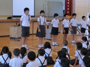 1学期の終業式でした。最初に2,4,6年の代表の児童が1学期に頑張ったことなどを発表し、校長からは「自分だけで頑張れるのが本物の力、○○を頑張ったといえる夏休みにしよう」と話がありました。式の後は、水泳記録会の表彰、童話発表会の代表紹介、その後、陸上競技とバレーボールで全国大会に出場する子どもたちが試合に向けての抱負を発表しました。最後に生徒指導担当から夏休みの暮らしについて説明があり終わりました。その後は各教室で、宿題をもらったり、通知表をjもらったりしました。1年生は初めての通知表をにこにこしながらもらっていました。残りの写真は行事アルバムに掲載します。