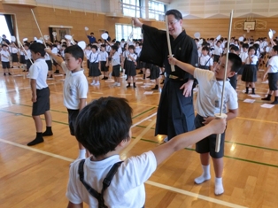 9月11日に開催されます「能」の巡回公演の事前学習としてワークショップがありました。最初に「能」の歴史についての話があり、その後、能面や服装、小道具等の説明を受け、実際に能「船弁慶」を歌ったり、すり足を体験したりしました。また、代表の子どもたちは、実際に能面を付けてすり足をしたり、小道具の刀を持って、戦の様子を舞ったりしました。礼をしてお面を付けることや、面にはたくさんの種類があることなど多くのことを教えていただきました。