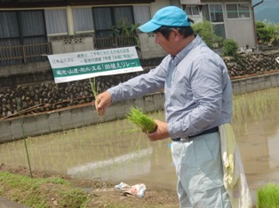 5年生が学校近くの田んぼで田植えをしました。田代先生を講師に、植え方を教えてもらい一斉に植えていきました。昨年、菊池川流域のストーリーが日本遺産に認定され、それにちなんで、今回、菊池川流域の3市1町で小学生による「田植えリレー」が行われます。山鹿市では菊鹿小が選ばれ、新聞等の取材もありました。残りの写真は行事アルバムに掲載しています。