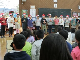 あんずっ子クラブのクリスマス会に招待され参加してきました。子どもたちのすてきなハンドベルで幕を開け、みんなでクリスマスにちなんだ歌を歌ったりゲームをしたりしました。一人一人の特技の発表では、けん玉、一輪車、縄跳び、あやとり、バレエ、スケートボード、計算などいろいろなものがあり、子どもたちの新しい一面を知ることができました。このあとトナカイがでてきたり、ごちそうがあったりと楽しいクリスマス会となったようです。私にまでごちそうをいただきありがとうございました。残りの写真は行事アルバムに掲載しています。