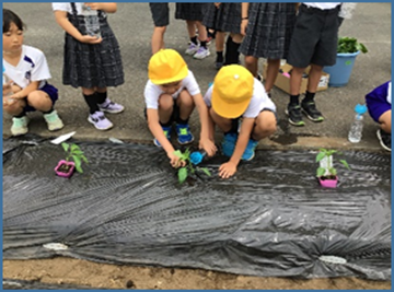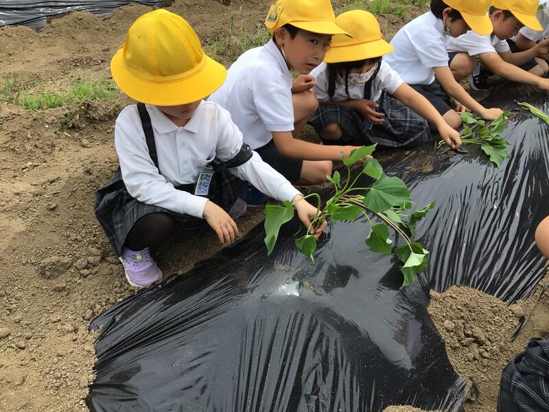 きゅうりとピーマンの苗を植えました。ミニトマトは1人ひと鉢で育てていますが、キュウリとピーマンは、班ごとに育てています。用務員の先生に、立派なきゅうり棚を作っていただきました。これからたくさんのきゅうりが収穫できるようにみんなで観察したり、育てたりしていきます。また、プールの横の畑では、1人ずつさつまいもの苗を植えました。