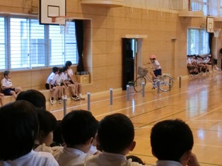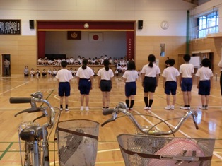 6月10日に鹿央体育館において子ども自転車大会が開催されます。その大会に向けて8名(2チーム)の児童が、菊鹿の交通指導隊の方々の指導のもと、1ヶ月近く練習に取り組んできました。大会を前に体育館で壮行会を行いました。頑張れ!菊鹿チーム。