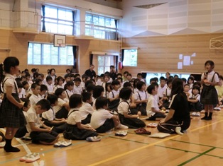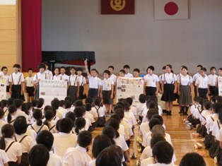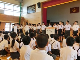 集会で6年生が修学旅行で学んだことを班ごとに発表しました。どの班の発表も立派で、それぞれの見学地でしっかりと学習ができていたことを感じました。そのあと、平和公園で行った平和集会のときの平和宣言を発表しました。被爆者の方が講話の後で言われた「平和のバトンを受け継いでいってほしい」という言葉をしっかりと受け止め、その思いを今日の発表に込め「平和のバトン」を下級生につなぐことができました。