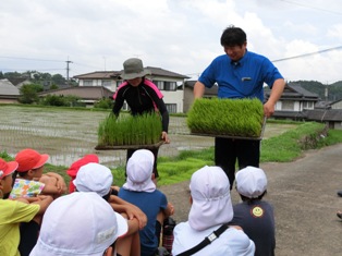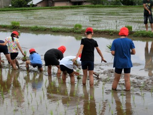 5年生が田植えをしました。下永野にある学校田(田代先生から借りています)まで徒歩で移動し、田代先生の指導を受けて田植えをしました。昔ながらに、ひもを張って目印のところに手で植えていき、昔の人の苦労も感じたことと思います。菊鹿小ではアイガモ農法で稲を育てます。苗の根がしっかりとはったらアイガモを入れる予定です。保護者の方にもご協力いただきありがとうございました。