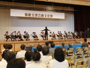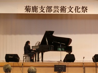 グリーンパルスで行われた菊鹿芸術文化祭に音楽部とピアノ教室に通っている子どもたちが出演しました。多くの地域の方々の前で堂々と演奏することができました。このような地域の行事に参加することは、子どもたちにできる地域への貢献であり、子どもたちの頑張りを地域に方々に知ってもらう場でもあります。壁面には全児童の、俳句や習字、絵が展示してありました。