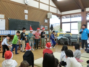 あんずっ子クラブのクリスマス会に招待され参加してきました。子どもたちのすてきなハンドベルで幕を開け、みんなでクリスマスにちなんだ歌を歌ったりゲームをしたりしました。一人一人の特技の発表では、けん玉、一輪車、縄跳び、あやとり、バレエ、スケートボード、計算などいろいろなものがあり、子どもたちの新しい一面を知ることができました。このあとトナカイがでてきたり、ごちそうがあったりと楽しいクリスマス会となったようです。私にまでごちそうをいただきありがとうございました。残りの写真は行事アルバムに掲載しています。