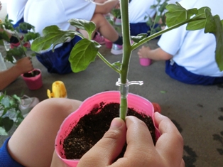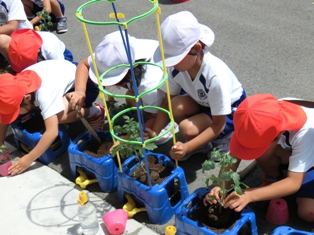 JAの方の指導で、2年生がトマトの苗を植えました。最初校舎東側のピロティで作業をしていましたが、風が強く苗が折れたりしたので、場所を図工室前に移して作業を行いました。苗の根元にはクリップが着いており、接ぎ木をして、元気に育てておいしトマトを作る工夫をしてあることや、根が水分や栄養をとりやすいように、苗を完全に土の中に入れず8分目までしか入れなくてよいことなどを教えていただきました。残りの写真は行事アルバムに掲載しています。