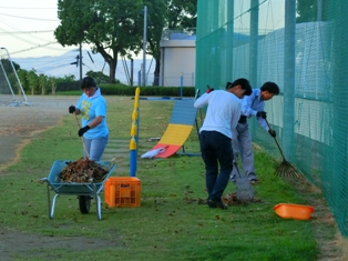 朝6時から7時まで、六郷地区の保護者の方々に美化作業をしていただきました。防球ネットの下にたまっていた落ち葉を集めていただいたり、運動場の草を取っていただいたり、斜面の草を刈っていただいたりして、すっかりきれいになりました。おかげで気持ちよく2学期を迎えることができます。