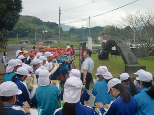 6年生が山鹿市商工会に協力いただいて、菊鹿一周歴史巡りをしました。相良寺、隈部氏館跡、日渡の洞口橋、鞠智城を周り、それぞれの場所で説明を聞きました。歴史学習をした後なので日本史の中の出来事といろいろなことがつながり、子どもたちも興味を持って熱心に話を聞いていました。残りの写真は行事アルバムに掲載します。