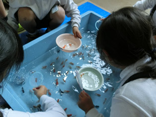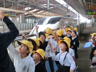1年生が見学旅行に行きました。最初に新玉名駅に行き、入場券を自分で買ってホームで係りの方から話を聞きました。新幹線にもいろいろな名前がついていることや北海道まで新幹線で行くことができることなどを教えていただきました。実際に新幹線が通過すると、そのスピードに大喜びというより大興奮状態で「すごいです」「ふきとばされそうです」とあちこちから聞こえました。そのあと、長洲にある「金魚の館」に移動し弁当を食べました。途中から小雨が降りだし合羽を着て秋探しをし、その後、金魚すくい、4Dシアター、えさやり体験をしました。学校に戻ってからも、全員から「また行きたい」との声が聞かれ、楽しい一日になったようです。残りの写真は行事アルバムに掲載します。
