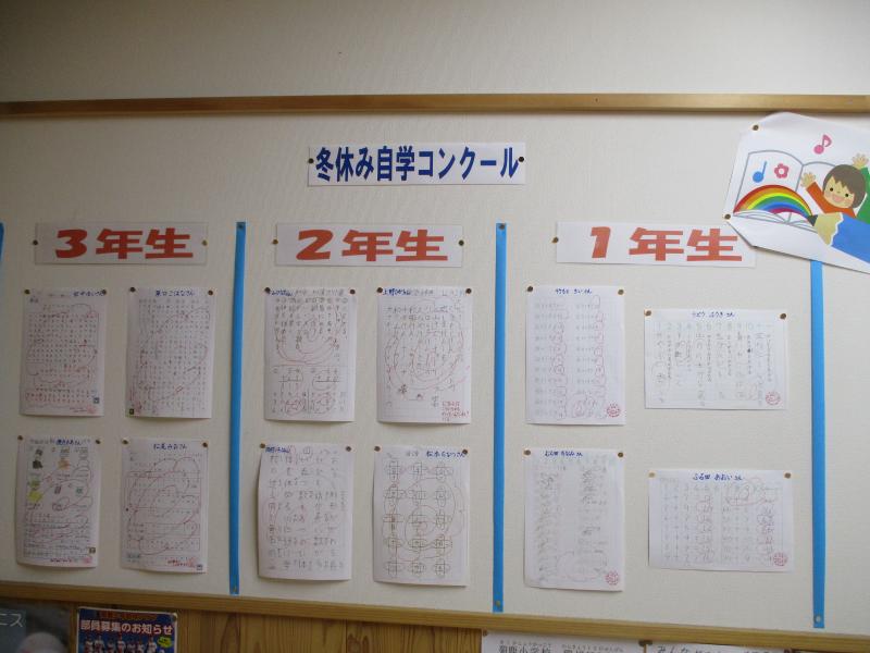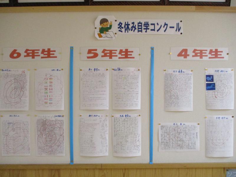 「冬休み自学コンクール」と称して、冬休みに自主学習に取り組んだ中で、特に素晴らしいノートを職員室前に掲示してあります。各学年とも4名が選出されていますが、どのノートもよく考えて学習がなされています。写真ではわかりにくいと思いますが・・・。2月にも自学コンクールが予定されていますので、考えて家庭学習に取り組んでみましょう。