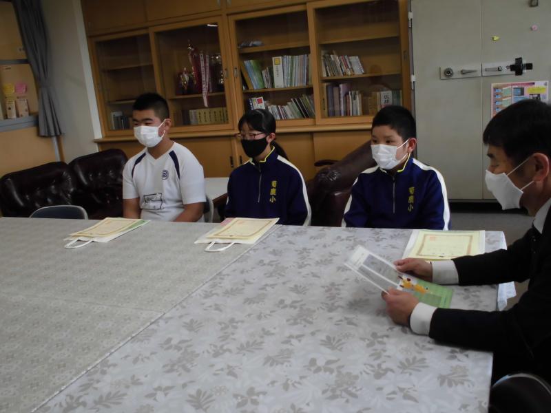 3月11日(木)、山鹿法人会の方に来校いただき、「第12回税に関する絵はがきコンクール」入賞の表彰をしていただきました。表彰を受けたのは6年生の永田栄心くん、古田穂花さん、飯川聖蘭くんの3人です。永田くん、古田さんの作品は、春休み中、鶴屋で展示されるそうです。おめでとうございます。他にもこの時期はたくさんの表彰のお知らせが届いています。詳しくは3月の学校便りでお伝えしたいと思います。