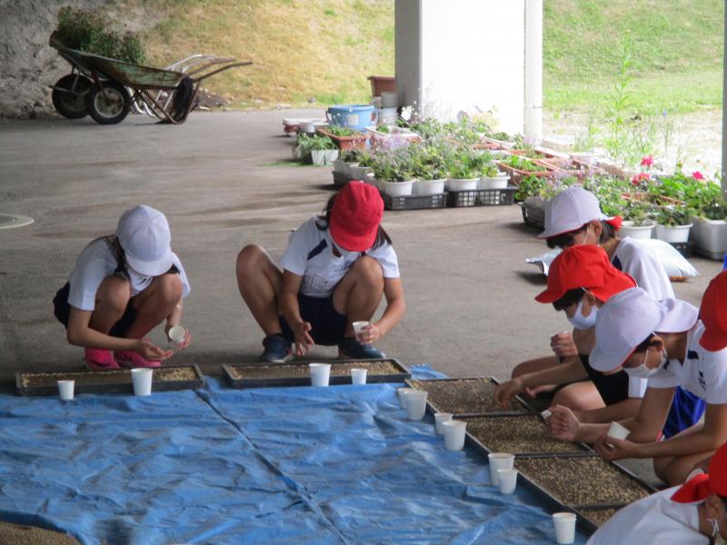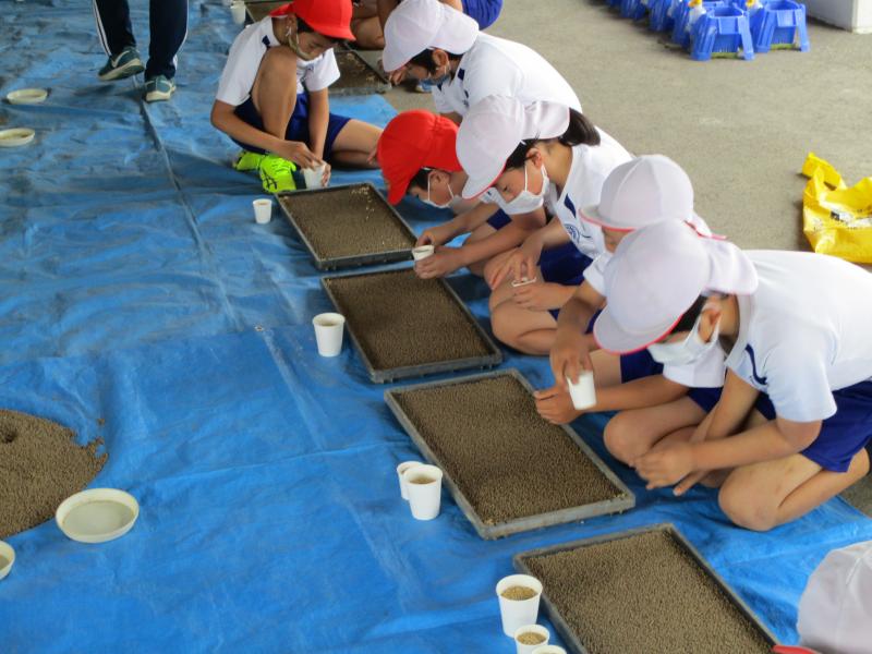 5月13日(木)の午後から5年生の種籾まきが行われました。今年も5年生の米作りは菊鹿小初代校長の田代先生の協力のもと進めていきます。5月6日に温湯消毒を済ませており、この日は丁寧に種籾まきを行い、早速田んぼへ向かいました。この後は田植えを行い、完全無農薬のアイガモ農法で育てていきます。