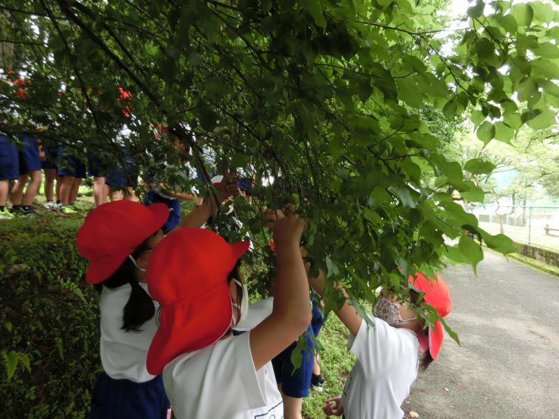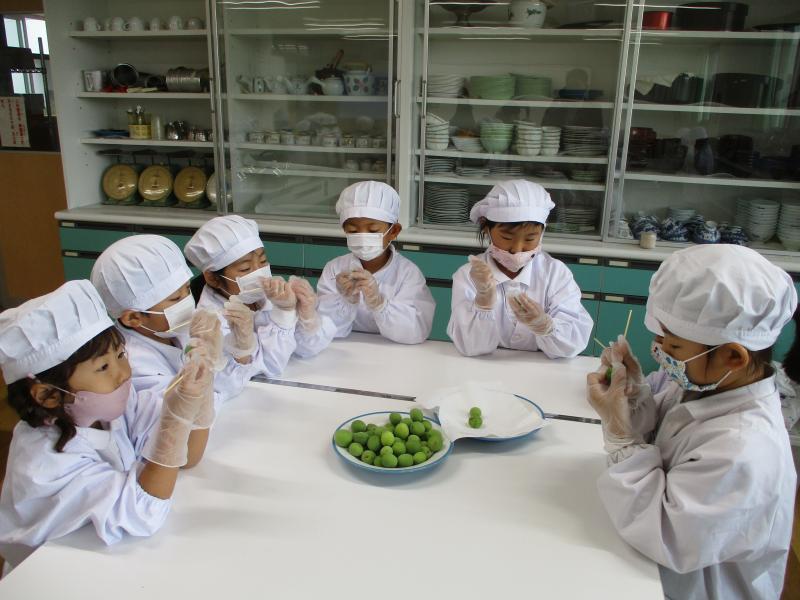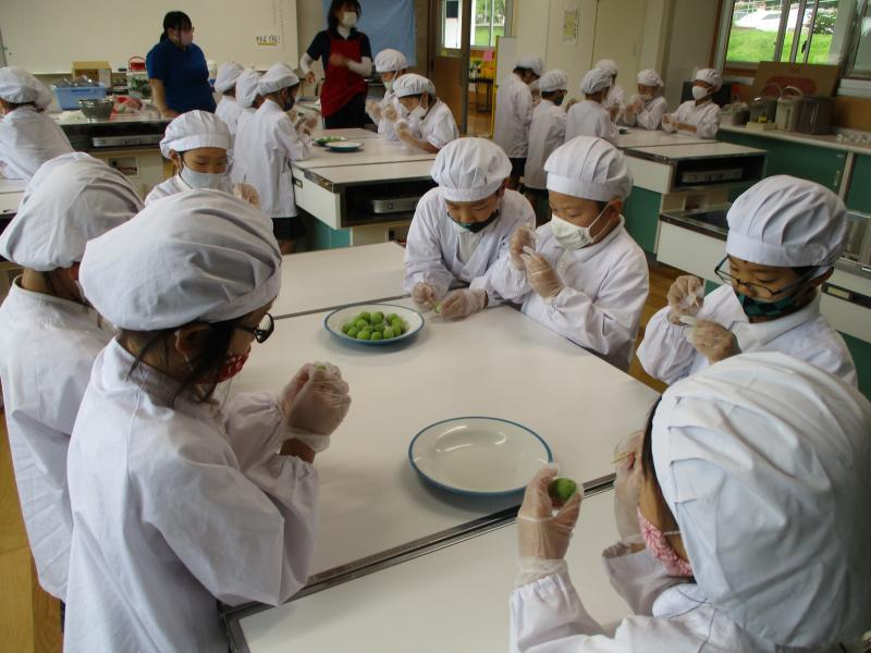 5月25日(火)に1、2年生が梅ちぎりを体験しました。そして26日(水)には家庭科室で梅シロップ作りをしました。写真は1年生、2年生が爪楊枝で梅に穴を空けている様子です。完成までしばらく待つことになりますが、昨年の梅シロップもとてもおいしかったので、おいしく飲める日が楽しみです。