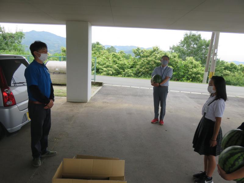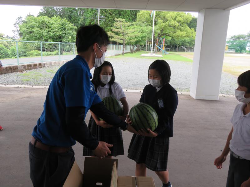 5月26日(水)にJA鹿本園芸部会から、菊鹿小に、スイカを贈呈して頂きました。児童を代表して6年生の給食委員が大きなスイカを受け取ってくれました。JAの職員の方からは「コロナ禍で小学生に笑顔になってもらいたいからスイカを送ります」といって頂き、給食副委員長の家入さんが「みんなでおいしくいただきます。ありがとうございました」とお礼を言ってくれました。本日、給食でおいしく頂きました。本当にありがとうございました。