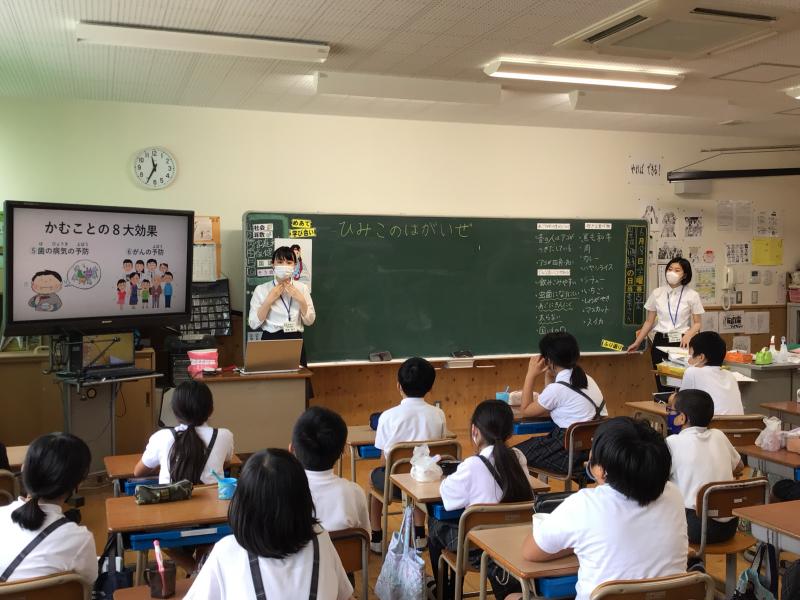 6月18日(金)に教育実習生による保健指導が5年生でありました。先月から2名の実習生が菊鹿小に来ています。6月の歯の衛生週間に合わせて、よく噛んで食べることや正しい歯みがきについて授業が行われました。ICT機器やイラスト、フラッシュカード等しっかり準備をされていましたので、5年生も楽しそうに授業に参加していました。授業で教わったことを普段の生活でも意識できるといいですね。