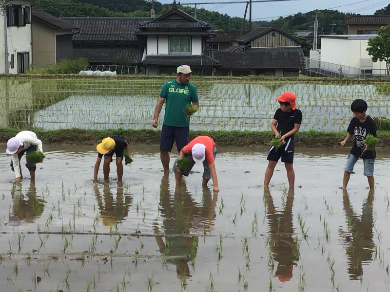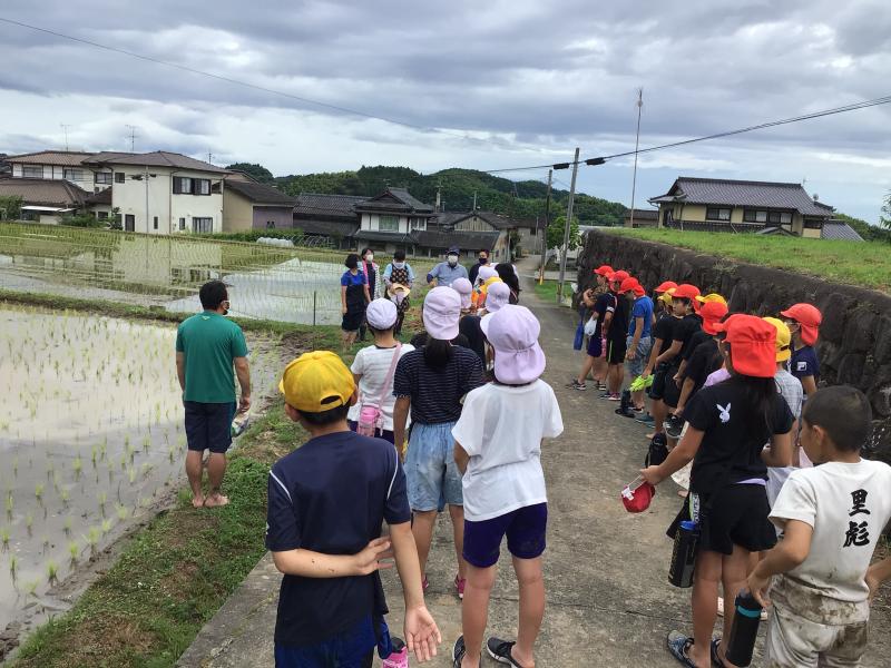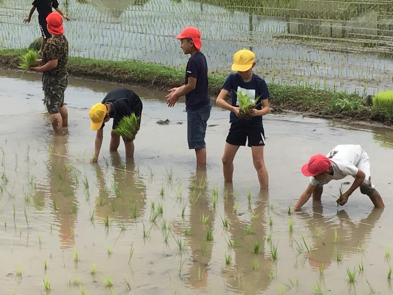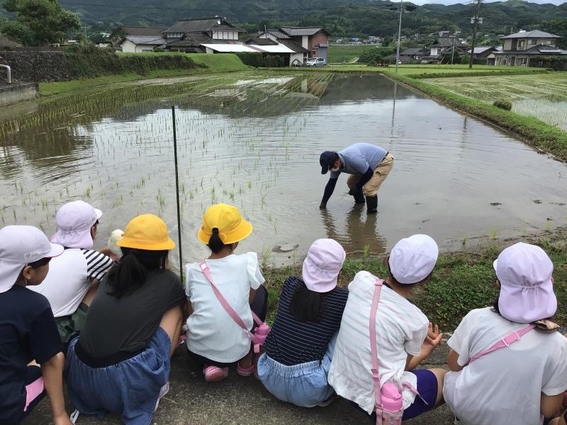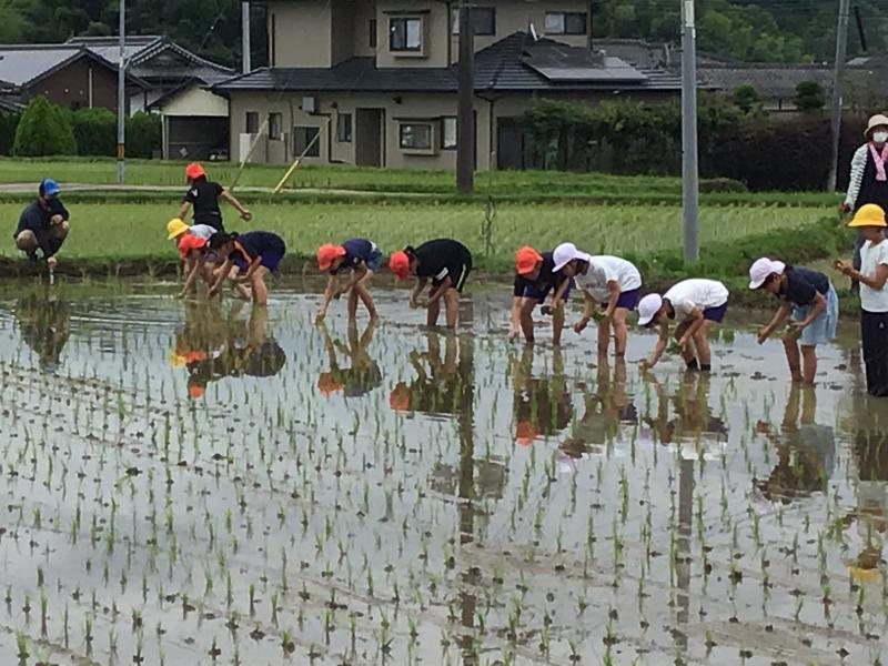 6月28日(月)の午前中5年生の田植えが行われました。天気が心配でしたが、菊鹿小初代校長の田代先生の指導と4名の保護者の方々の協力で、子どもたちも喜んで田植えを行いました。最初は要領がわからなかった子どもたちも後ではスムーズに田植えできるようになっていました。最後は協力いただいた田代先生と保護者の皆様にお礼を言って帰校しました。この後はアイガモを放し、完全無農薬のアイガモ農法で育てていきます。