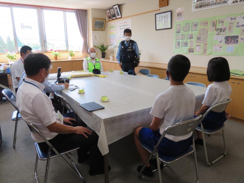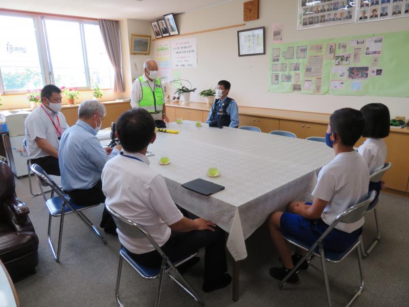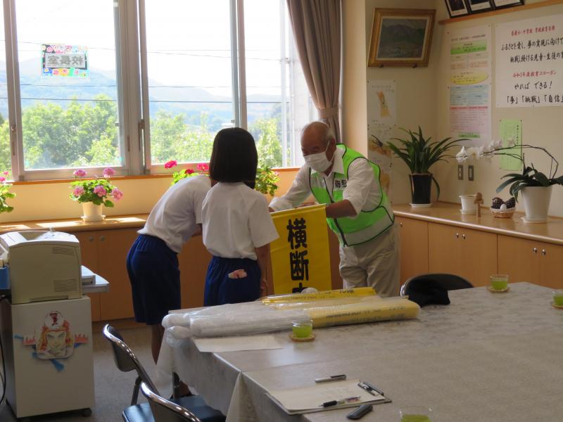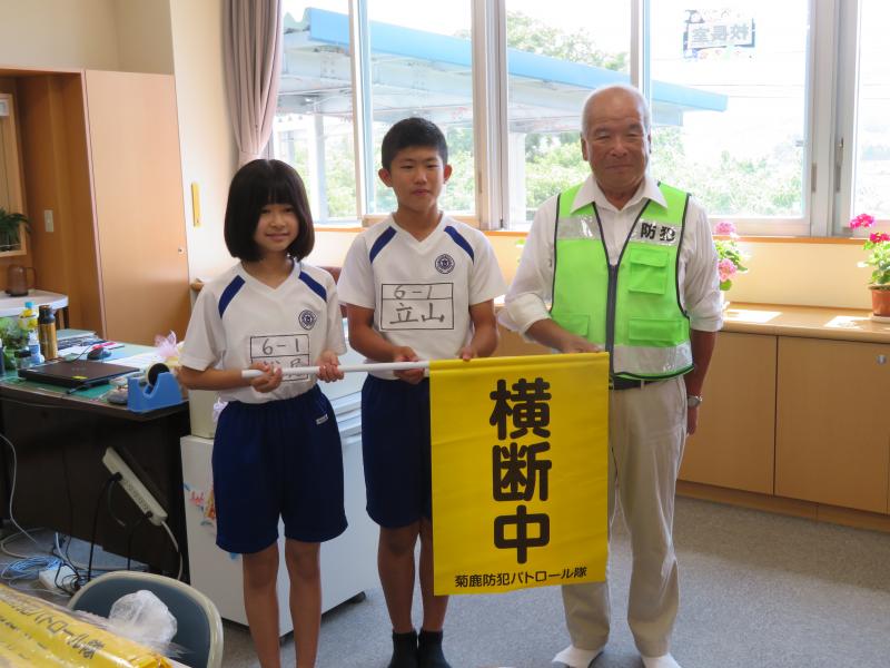 6月29日(火)に菊鹿町防犯パトロール隊の青木会長、塚本さん、菊鹿駐在官の松田さんが来校され、横断旗を贈呈していただきました。青木会長からは「菊鹿小の子どもたちは毎朝元気にあいさつをして登校している。命を大切にしてください」と言っていただき、松田駐在官からは「安全に登下校するためにも高学年が低学年をしっかり守ってください」と言っていただきました。児童を代表して運営委員会の立山委員長と松尾副委員長がお礼の言葉を言ってくれました。本当にありがとうございました。