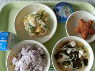 今日の給食には「星形コロッケ」「七夕ゼリー」がありました。給食では行事や地域にちなんだ給食が時々あります。今日は七夕にちなんだメニューでした。子どもたちも喜んで食べていました。