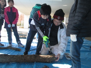 学校で椎茸コマ打ち体験をしました。虹の会の方々に教えていただき、保護者と子どもたちが一緒に、木にドリルで穴を開けたりコマを打ち込んだりしました。できあがったものを運動場の横の杉林の中に運びました。2年後には椎茸が生えてくるそうです。残りの写真は行事アルバムに掲載します。