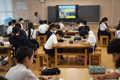 本日は、5年生対象に県庁からの出前講座「水の学校」がありました。熊本ンお宝である地下水の大切さを学ぶ取組です。子どもたちは、熊本の地下水の歴史や成り立ち、地下水の現状と課題について学ぶことができました。