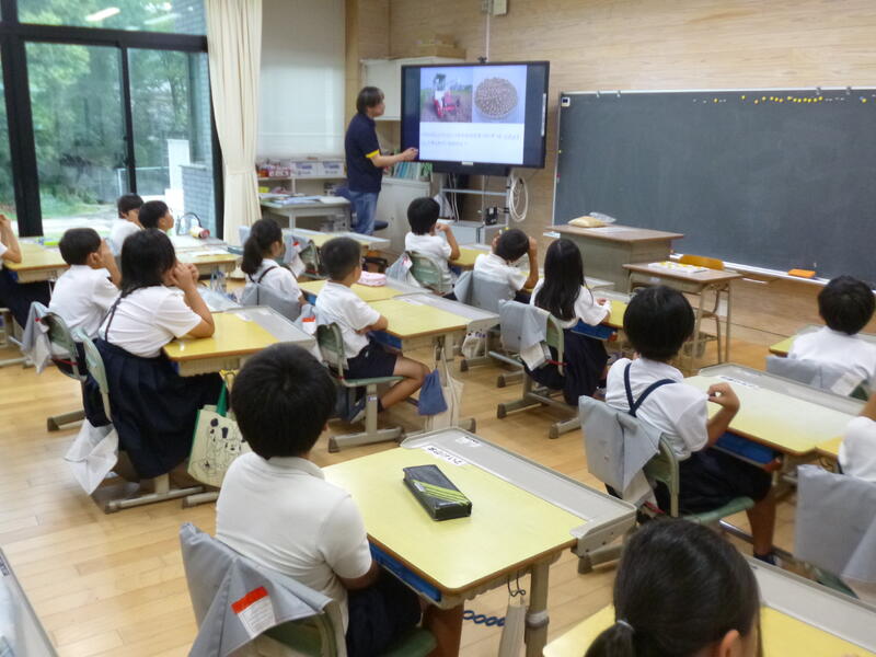 3年生が大豆の学習を始めています。今日は丸美屋さんに来ていただき、大豆について詳しく教えていただきました。今後、学校正門横の畑に大豆の播種(たねまき)をする予定です。