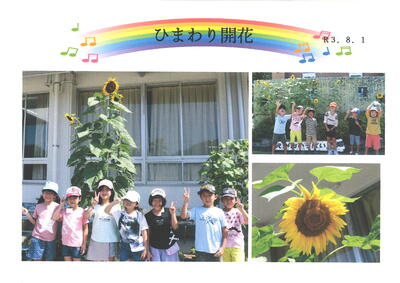前期前半に植えていたひまわりが大きく成長し、素敵な花を咲かせました。職員室からも元気な様子が見られます。夏休み前に、子どもたちが心を込めてお世話をしていたからですね。学童に来ていた子どもたちと一緒に写真を撮りました。
