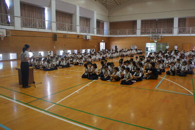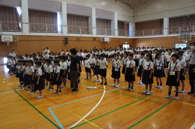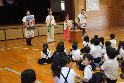 いよいよ夏休みです。夏休み前集会には、古墳祭のキャラバン隊にも来ていただきました。