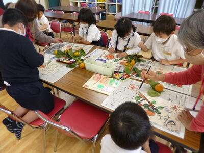 今日の放課後子ども教室で、こどもたちは絵手紙に挑戦しました。モチーフは秋の味覚「柿」です。いろいろな柿が描かれていました。