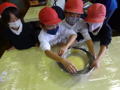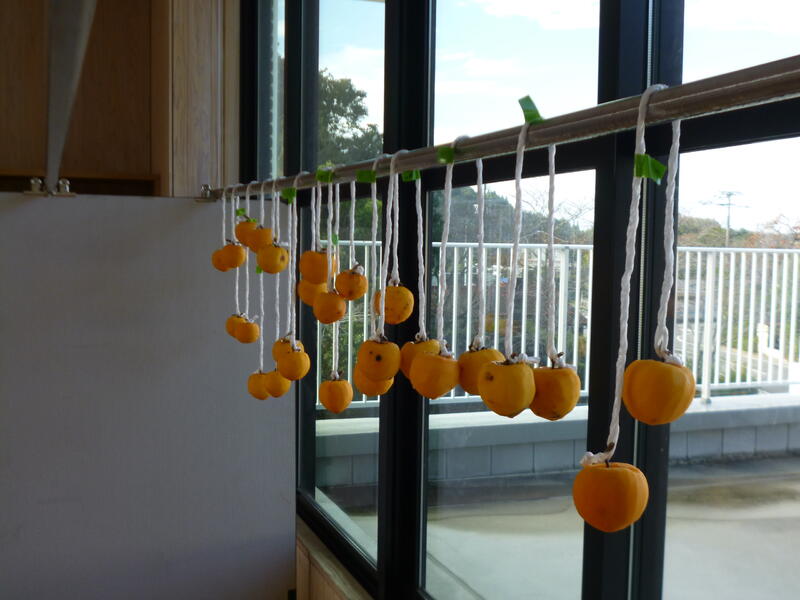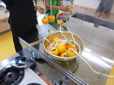 本日は、6年生のこどもたちが、地域の方からいただいた柿を利用して干し柿づくりに挑戦しました。