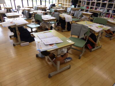 今日は、県民の防災意識や自助力の向上を図るため、県民総参加型の地震発生時の初動対応訓練「熊本シェイクアウト訓練」を実施しました。10時の訓練放送に合わせて、こどもたちは1分間揺れがおさまるまで、机の下にもぐり、頭や身体を守る行動をしました。