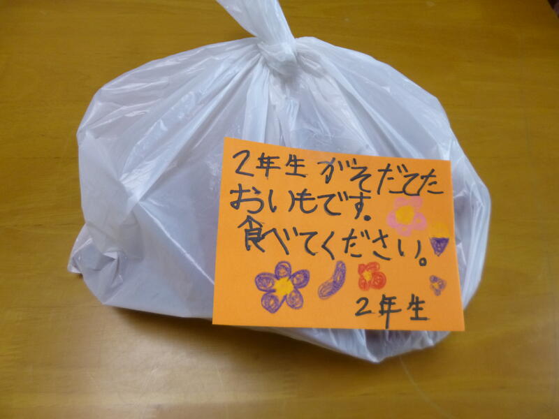 今朝、西門でこどもたちの登校を迎えていると、運動場のほうから走ってくる2年生が二人。「芋掘りを手伝ってくれてありがとうございました。食べてください。」とお芋をプレゼントしてくれました。